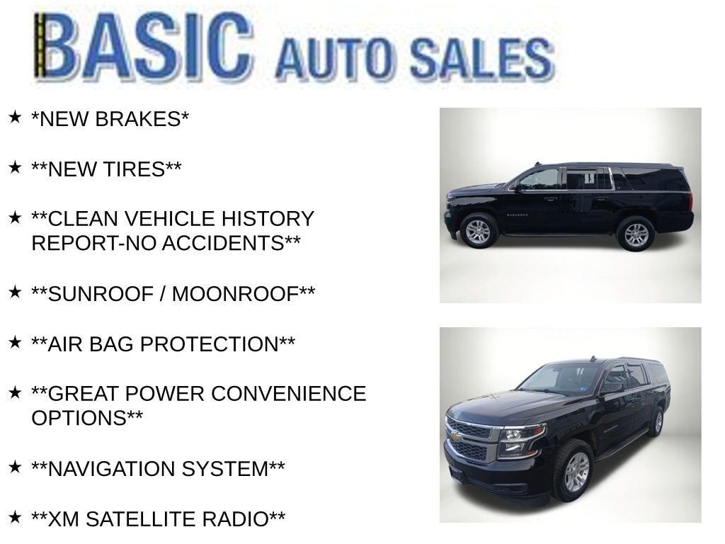 Black 2018 Chevrolet Suburban LT 4WD 6-Speed Automatic Electronic with Overdrive EcoTec3 5.3L V8 *NEW BRAKES*, **NEW TIRES**, **CLEAN VEHICLE HISTORY REPORT-NO ACCIDENTS**, **SUNROOF / MOONROOF**, **AIR BAG PROTECTION**, **GREAT POWER CONVENIENCE OPTIONS**, **NAVIGATION SYSTEM**, **XM SATELLITE RADIO**, **HEATED LEATHER FRONT SEATING**, **POWER REAR LIFT GATE FOR CONVENIENCE**, 2 keys.