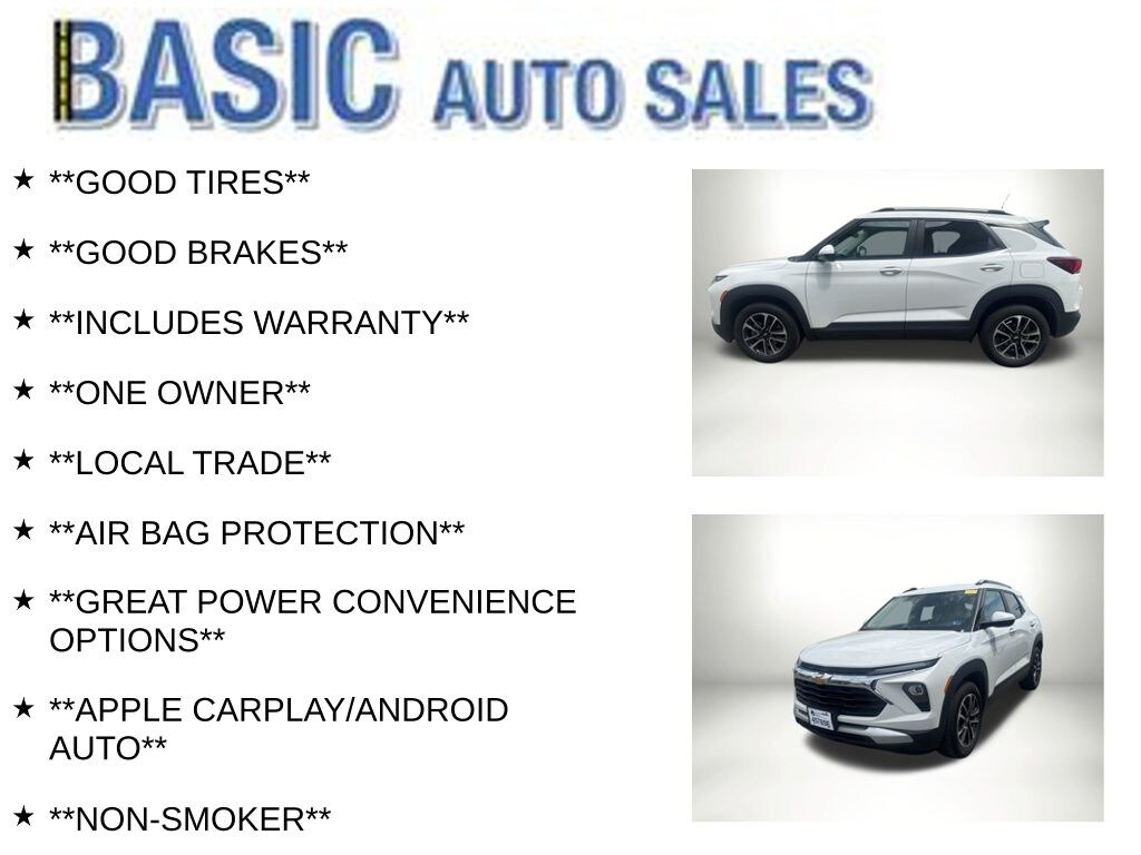 Summit White 2025 Chevrolet TrailBlazer LT FWD CVT 1.3L I3 Turbocharged DOHC 12V LEV3-SULEV30 137hp **GOOD TIRES**, **GOOD BRAKES**, **INCLUDES WARRANTY**, **ONE OWNER**, **LOCAL TRADE**, **AIR BAG PROTECTION**, **GREAT POWER CONVENIENCE OPTIONS**, **APPLE CARPLAY/ANDROID AUTO**, **NON-SMOKER**, **LOADED WITH SAFETY FEATURES**, **BLIND SPOT MONITOR SYSTEM**, **LANE KEEP ASSIST**, **LANE DEPARTURE WARNING**, **BACK UP CAMERA**, 2 keys.