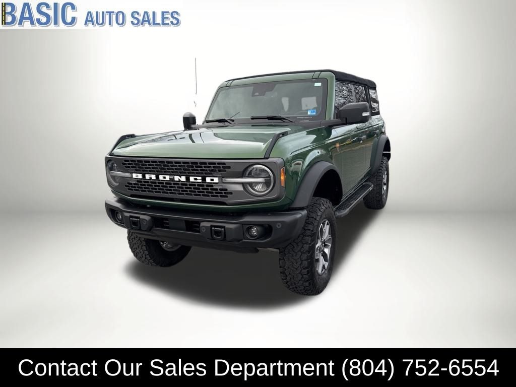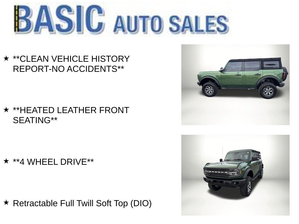 Green Metallic 2022 Ford Bronco Badlands 4WD 7-Speed Manual 2.3L EcoBoost I-4 **CLEAN VEHICLE HISTORY REPORT-NO ACCIDENTS**, **HEATED LEATHER FRONT SEATING**, **4 WHEEL DRIVE**, Retractable Full Twill Soft Top (DIO).