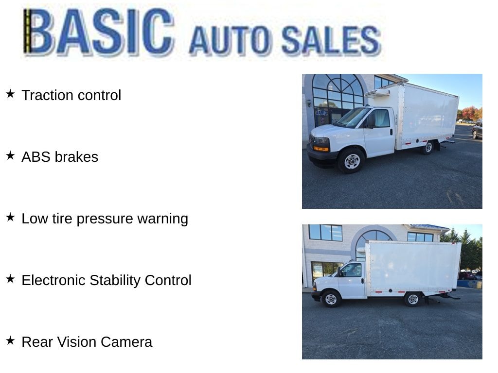 2019 GMC Savana 3500 12' Refer Box RWD 8-Speed Automatic with Overdrive 4.3L V6 Air Conditioning, Cruise Control, Driver Convenience Package, Exterior Parking Camera Rear, Lane Departure Warning System, Power Convenience Package, Power Door Locks w/Lock-Out Protection, Power Windows, Preferred Equipment Group 1WT, Tilt Steering Wheel, Traction control, 2 Speakers, 3.42 Rear Axle Ratio, 4-Wheel Disc Brakes, ABS brakes, AM/FM radio, Body Soft-Mount Donut & Bolt, Delay-off headlights, Driver & Front Passenger High-Back Bucket Seats, Driver door bin, Driver's Seat Mounted Armrest, Dual front impact airbags, Dual front side impact airbags, Electronic Stability Control, Emergency communication system: OnStar Guidance, Forward Collision Alert, Front anti-roll bar, Front Bucket Seats, Front License Plate Kit, Front wheel independent suspension, Fully automatic headlights, Inside Rear-View Mirror, Low tire pressure warning, Occupant sensing airbag, Overhead airbag, Painted White Wheels, Passenger cancellable airbag, Passenger door bin, Passenger seat mounted armrest, Power steering, Radio: AM/FM Stereo w/MP3 Player & Digital Clock, Rear Vision Camera, Remote Keyless Entry, Single Rear Wheel Configuration, Tachometer, Theft Alarm Notification, Trip computer, Variably intermittent wipers, Vinyl Seat Trim, Voltmeter, Wheels: 16" x 6.5" 8-Lug Painted Steel HD (4), Air Conditioning, Cruise Control, Driver Convenience Package, Exterior Parking Camera Rear, Lane Departure Warning System, Power Convenience Package, Power Door Locks w/Lock-Out Protection, Power Windows, Preferred Equipment Group 1WT, Tilt Steering Wheel, Traction control.