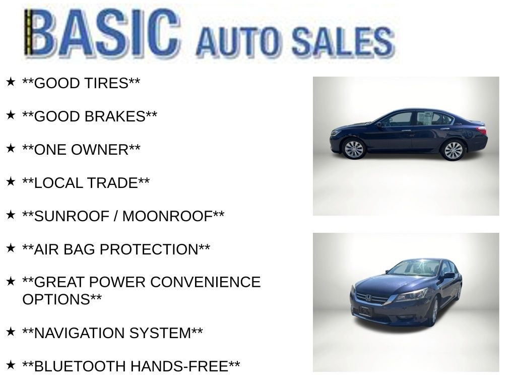 Obsidian Blue 2014 Honda Accord EX-L FWD CVT 2.4L I4 DOHC i-VTEC 16V **GOOD TIRES**, **GOOD BRAKES**, **ONE OWNER**, **LOCAL TRADE**, **SUNROOF / MOONROOF**, **AIR BAG PROTECTION**, **GREAT POWER CONVENIENCE OPTIONS**, **NAVIGATION SYSTEM**, **BLUETOOTH HANDS-FREE**, **HEATED LEATHER FRONT SEATING**, **HEATED FRONT SEATS**, **NON-SMOKER**, **REMOTE START**, one owner all service records.