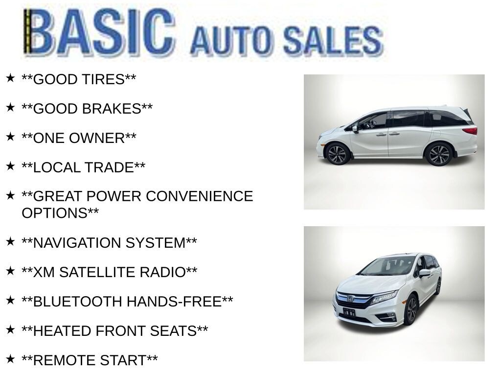 Diamond White Pearl 2019 Honda Odyssey Elite FWD 10-Speed Automatic 3.5L V6 SOHC i-VTEC 24V **GOOD TIRES**, **GOOD BRAKES**, **ONE OWNER**, **LOCAL TRADE**, **GREAT POWER CONVENIENCE OPTIONS**, **NAVIGATION SYSTEM**, **XM SATELLITE RADIO**, **BLUETOOTH HANDS-FREE**, **HEATED FRONT SEATS**, **REMOTE START**, **LOADED WITH SAFETY FEATURES**, **BLIND SPOT MONITOR SYSTEM**, **LANE KEEP ASSIST**, **LANE DEPARTURE WARNING**, **FRONT COLLISION WARNING**, **BACK UP CAMERA**, **POWER DRIVERS SEAT**, 2 keys.