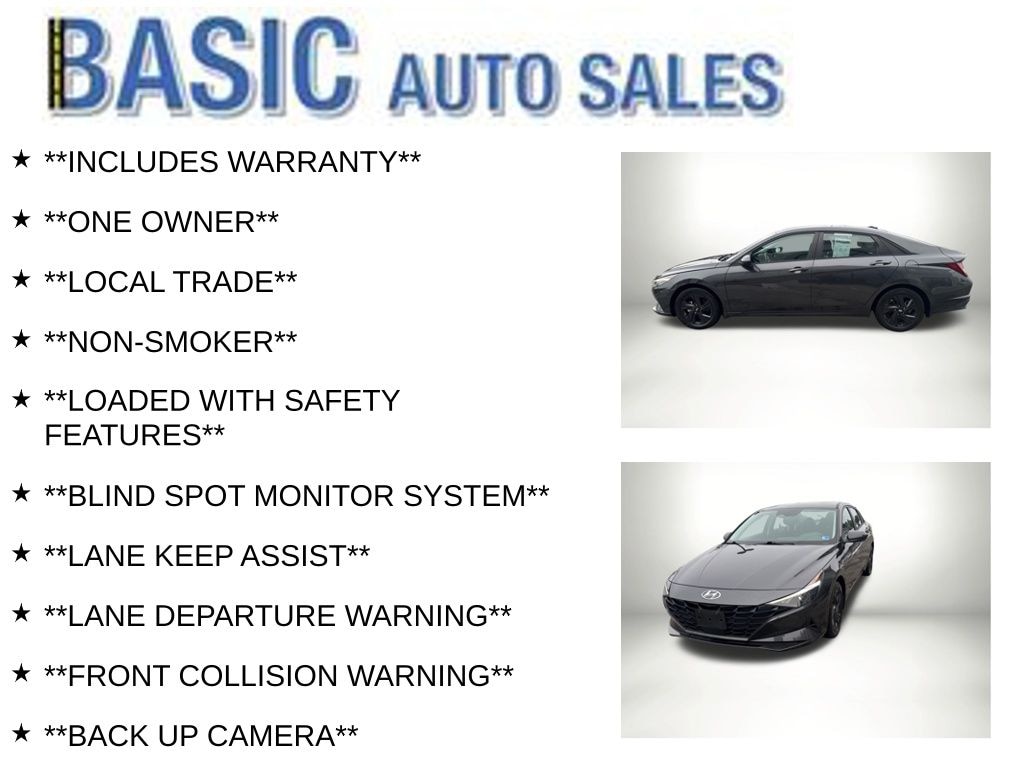 Portofino Gray 2022 Hyundai Elantra SEL FWD CVT 2.0L 4-Cylinder DOHC 16V **INCLUDES WARRANTY**, **ONE OWNER**, **LOCAL TRADE**, **NON-SMOKER**, **LOADED WITH SAFETY FEATURES**, **BLIND SPOT MONITOR SYSTEM**, **LANE KEEP ASSIST**, **LANE DEPARTURE WARNING**, **FRONT COLLISION WARNING**, **BACK UP CAMERA**, 2keys, CRUISE CONTROL STEERING.