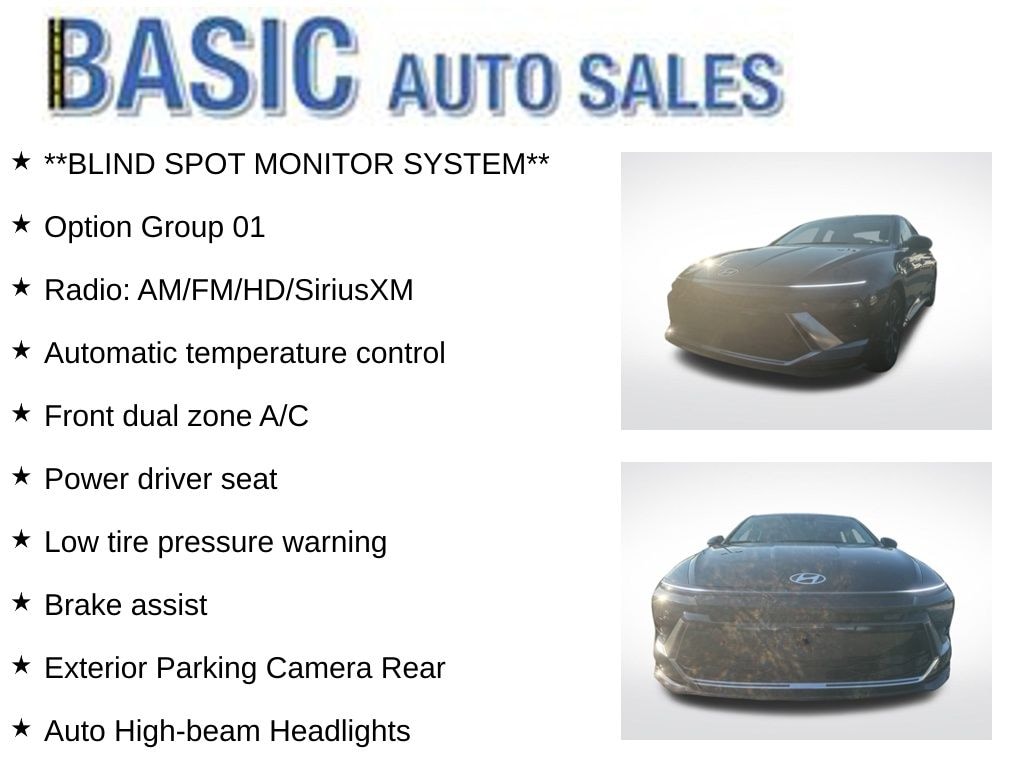Carbon Blue 2025 Hyundai Sonata SEL AWD 8-Speed Automatic I4 **BLIND SPOT MONITOR SYSTEM**, Active Cruise Control, Alloy wheels, Apple CarPlay & Android Auto, Auto High-beam Headlights, Automatic temperature control, Brake assist, Exterior Parking Camera Rear, Front dual zone A/C, Fully automatic headlights, Heated front seats, Low tire pressure warning, Option Group 01, Power driver seat, Radio: AM/FM/HD/SiriusXM, Telescoping steering wheel.