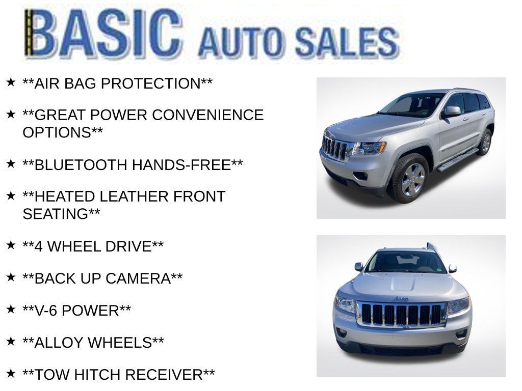Bright Silver Metallic Clearcoat 2011 Jeep Grand Cherokee Laredo 4WD 5-Speed Automatic 3.6L V6 Flex Fuel 24V VVT **AIR BAG PROTECTION**, **GREAT POWER CONVENIENCE OPTIONS**, **BLUETOOTH HANDS-FREE**, **HEATED LEATHER FRONT SEATING**, **4 WHEEL DRIVE**, **BACK UP CAMERA**, **V-6 POWER**, **ALLOY WHEELS**, **TOW HITCH RECEIVER**, **POWER DRIVERS SEAT**.