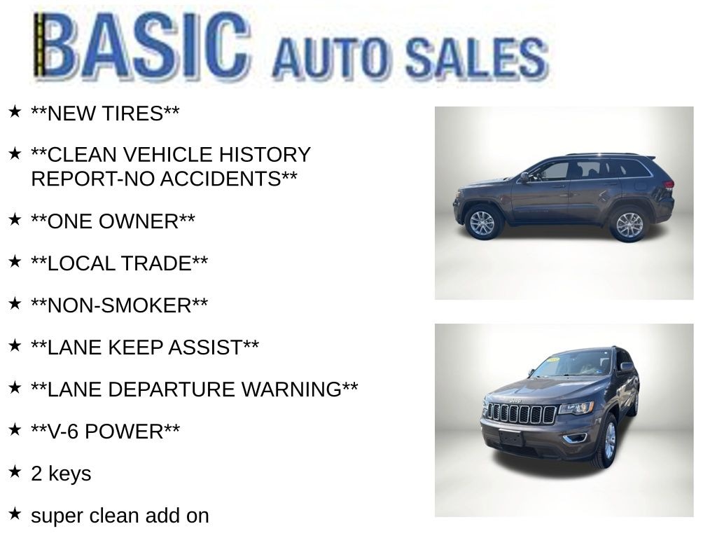 Granite Crystal Metallic Clearcoat 2021 Jeep Grand Cherokee Laredo E 4WD 8-Speed Automatic 3.6L V6 24V VVT **NEW TIRES**, **CLEAN VEHICLE HISTORY REPORT-NO ACCIDENTS**, **ONE OWNER**, **LOCAL TRADE**, **NON-SMOKER**, **LANE KEEP ASSIST**, **LANE DEPARTURE WARNING**, **V-6 POWER**, 2 keys, super clean add on, Air Conditioning, Apple CarPlay, Apple CarPlay / Android Auto, Automatic temperature control, Cloth Bucket Seats, Compass, Driver door bin, Driver vanity mirror, Four wheel independent suspension, Front Bucket Seats, Front Center Armrest w/Storage, Front dual zone A/C, Front License Plate Bracket, Front reading lights, Google Android Auto, Heated door mirrors, Illuminated entry, Integrated Voice Command w/Bluetooth, Leather Shift Knob, LED Daytime Running Headlamps, Navigation System, Normal Duty Suspension, Outside temperature display, Overhead console, Passenger door bin, Passenger vanity mirror, Power door mirrors, Power driver seat, Power steering, Power windows, Quick Order Package 2BE Laredo E, Rear reading lights, Rear seat center armrest, Rear window defroster, Remote keyless entry, Roof rack: rails only, Split folding rear seat, Spoiler, Steering Wheel Mounted Audio Controls, Steering wheel mounted audio controls, Tachometer, Telescoping steering wheel, Tilt steering wheel, Trip computer.