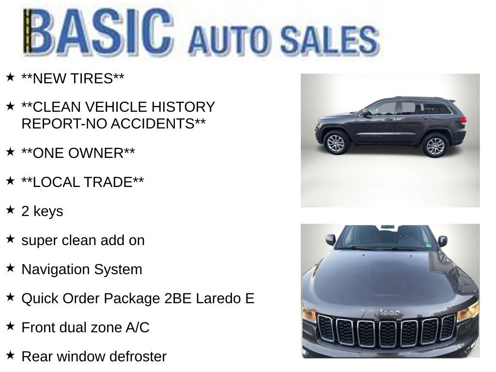 Granite Crystal Metallic Clearcoat 2021 Jeep Grand Cherokee Laredo E 4WD 8-Speed Automatic 3.6L V6 24V VVT **NEW TIRES**, **CLEAN VEHICLE HISTORY REPORT-NO ACCIDENTS**, **ONE OWNER**, **LOCAL TRADE**, 2 keys, super clean add on, Air Conditioning, Apple CarPlay, Apple CarPlay / Android Auto, Automatic temperature control, Cloth Bucket Seats, Compass, Driver door bin, Driver vanity mirror, Four wheel independent suspension, Front Bucket Seats, Front Center Armrest w/Storage, Front dual zone A/C, Front License Plate Bracket, Front reading lights, Google Android Auto, Heated door mirrors, Illuminated entry, Integrated Voice Command w/Bluetooth, Leather Shift Knob, LED Daytime Running Headlamps, Navigation System, Normal Duty Suspension, Outside temperature display, Overhead console, Passenger door bin, Passenger vanity mirror, Power door mirrors, Power driver seat, Power steering, Power windows, Quick Order Package 2BE Laredo E, Rear reading lights, Rear seat center armrest, Rear window defroster, Remote keyless entry, Roof rack: rails only, Split folding rear seat, Spoiler, Steering Wheel Mounted Audio Controls, Steering wheel mounted audio controls, Tachometer, Telescoping steering wheel, Tilt steering wheel, Trip computer.