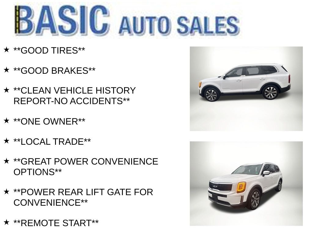 Glacial White Pearl 2022 Kia Telluride EX FWD 8-Speed Automatic 3.8L V6 DOHC **GOOD TIRES**, **GOOD BRAKES**, **CLEAN VEHICLE HISTORY REPORT-NO ACCIDENTS**, **ONE OWNER**, **LOCAL TRADE**, **GREAT POWER CONVENIENCE OPTIONS**, **POWER REAR LIFT GATE FOR CONVENIENCE**, **REMOTE START**, **LOADED WITH SAFETY FEATURES**, **BLIND SPOT MONITOR SYSTEM**, **LANE KEEP ASSIST**, **LANE DEPARTURE WARNING**, **V-6 POWER**, **3 ROW SEATING**, **ALLOY WHEELS**.