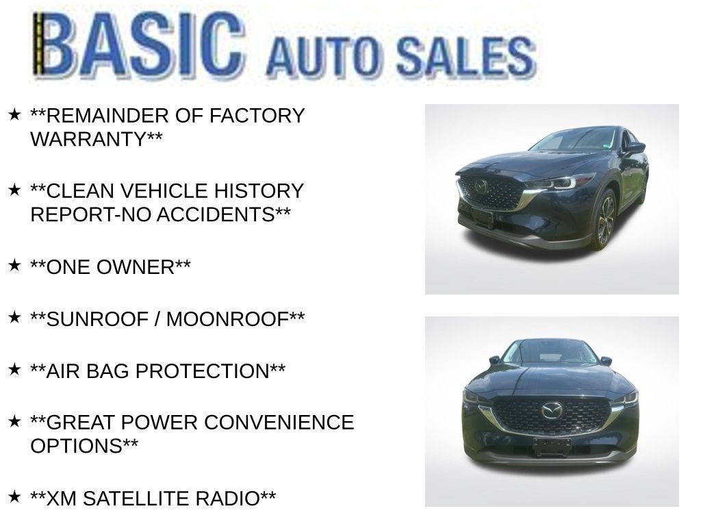 Deep Crystal Blue Mica 2023 Mazda CX-5 2.5 S Premium Package AWD 6-Speed Automatic SKYACTIV® 2.5L 4-Cylinder DOHC 16V **REMAINDER OF FACTORY WARRANTY**, **CLEAN VEHICLE HISTORY REPORT-NO ACCIDENTS**, **ONE OWNER**, **SUNROOF / MOONROOF**, **AIR BAG PROTECTION**, **GREAT POWER CONVENIENCE OPTIONS**, **XM SATELLITE RADIO**, **APPLE CARPLAY/ANDROID AUTO**, **BLUETOOTH HANDS-FREE**, **HEATED LEATHER FRONT SEATING**, **ALL WHEEL DRIVE**, **POWER REAR LIFT GATE FOR CONVENIENCE**, **LOADED WITH SAFETY FEATURES**, **BLIND SPOT MONITOR SYSTEM**, **LANE KEEP ASSIST**, **LANE DEPARTURE WARNING**, **FRONT COLLISION WARNING**, **BACK UP CAMERA**, **GREAT GAS MILEAGE---FUEL EFFICIENT**, **ALLOY WHEELS**, **POWER PASSENGER SEAT**, **POWER DRIVERS SEAT**.