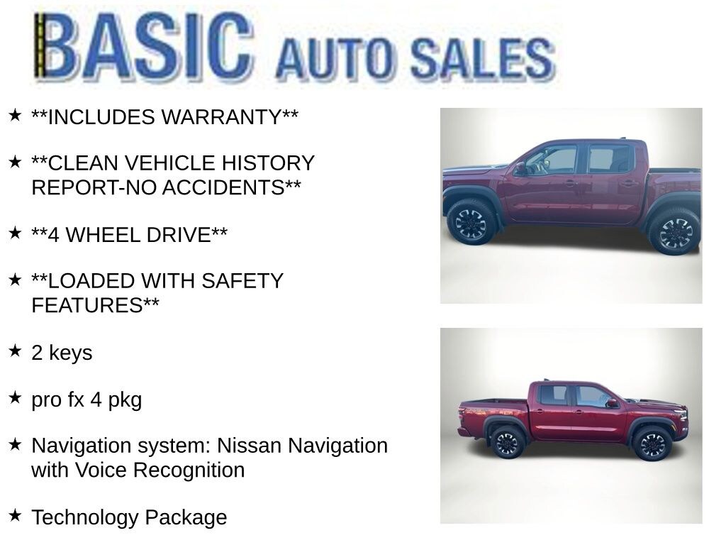 Cardinal Red Tricoat 2022 Nissan Frontier PRO-4X 4WD 9-Speed Automatic 3.8L DI DOHC 24V V6 **INCLUDES WARRANTY**, **CLEAN VEHICLE HISTORY REPORT-NO ACCIDENTS**, **4 WHEEL DRIVE**, **LOADED WITH SAFETY FEATURES**, 2 keys, pro fx 4 pkg, Blind Spot Warning, High Beam Assist (HBA), Intelligent Cruise Control, Lane Departure Warning System, Navigation system: Nissan Navigation with Voice Recognition, Rear Automatic Braking (RAB), Rear Cross Traffic Alert (RCTA), Rear Sonar System, Technology Package, Traffic Sign Recognition (TSR).