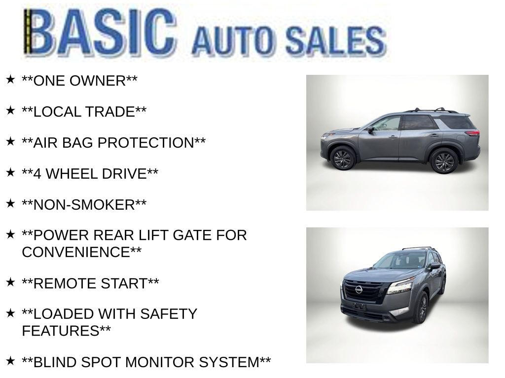 Gun Metallic 2022 Nissan Pathfinder SV 4WD 9-Speed Automatic V6 **ONE OWNER**, **LOCAL TRADE**, **AIR BAG PROTECTION**, **4 WHEEL DRIVE**, **NON-SMOKER**, **POWER REAR LIFT GATE FOR CONVENIENCE**, **REMOTE START**, **LOADED WITH SAFETY FEATURES**, **BLIND SPOT MONITOR SYSTEM**, **LANE KEEP ASSIST**, **LANE DEPARTURE WARNING**, **FRONT COLLISION WARNING**, **BACK UP CAMERA**, 2 keys.