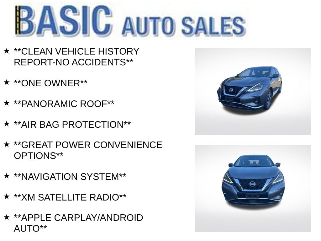 Gun Metallic 2023 Nissan Murano SL AWD CVT with Xtronic 3.5L V6 DOHC 24V **CLEAN VEHICLE HISTORY REPORT-NO ACCIDENTS**, **ONE OWNER**, **PANORAMIC ROOF**, **AIR BAG PROTECTION**, **GREAT POWER CONVENIENCE OPTIONS**, **NAVIGATION SYSTEM**, **XM SATELLITE RADIO**, **APPLE CARPLAY/ANDROID AUTO**, **BLUETOOTH HANDS-FREE**, **ALL WHEEL DRIVE**, **POWER REAR LIFT GATE FOR CONVENIENCE**, **BLIND SPOT MONITOR SYSTEM**, **LANE KEEP ASSIST**, **LANE DEPARTURE WARNING**, **FRONT COLLISION WARNING**, **BACK UP CAMERA**, **V-6 POWER**, **ALLOY WHEELS**, **POWER PASSENGER SEAT**, **POWER DRIVERS SEAT**, **BOSE PREMIUM AUDIO**, **HEATED LEATHER FRONT AND REAR SEATING**.