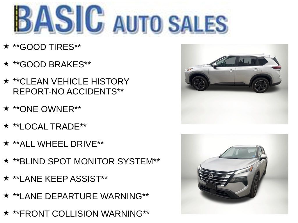 Brilliant Silver Metallic 2024 Nissan Rogue SV AWD CVT with Xtronic 1.5L DOHC **GOOD TIRES**, **GOOD BRAKES**, **CLEAN VEHICLE HISTORY REPORT-NO ACCIDENTS**, **ONE OWNER**, **LOCAL TRADE**, **ALL WHEEL DRIVE**, **BLIND SPOT MONITOR SYSTEM**, **LANE KEEP ASSIST**, **LANE DEPARTURE WARNING**, **FRONT COLLISION WARNING**, **BACK UP CAMERA**, 2 keys.