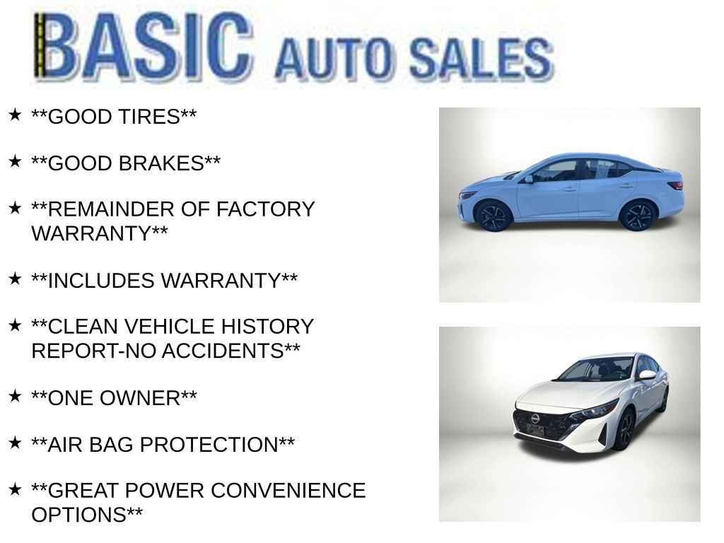 Fresh Powder 2024 Nissan Sentra SV FWD CVT with Xtronic 2.0L I4 DOHC **GOOD TIRES**, **GOOD BRAKES**, **REMAINDER OF FACTORY WARRANTY**, **INCLUDES WARRANTY**, **CLEAN VEHICLE HISTORY REPORT-NO ACCIDENTS**, **ONE OWNER**, **AIR BAG PROTECTION**, **GREAT POWER CONVENIENCE OPTIONS**, **NON-SMOKER**, **LOADED WITH SAFETY FEATURES**, **BLIND SPOT MONITOR SYSTEM**, **LANE KEEP ASSIST**, **LANE DEPARTURE WARNING**, **BACK UP CAMERA**, **GREAT GAS MILEAGE---FUEL EFFICIENT**, 2 keys.