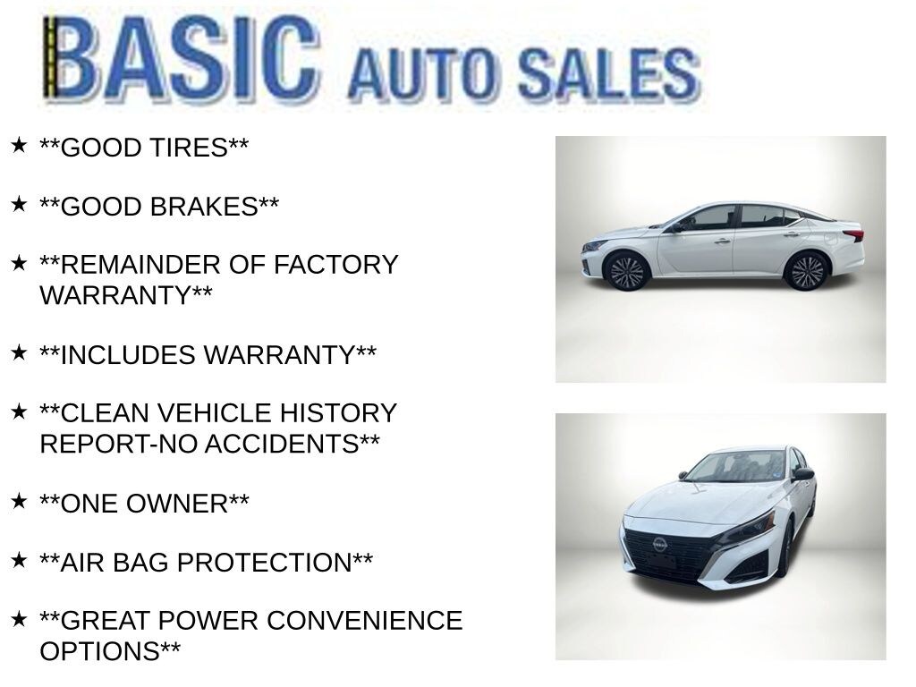 Glacier White 2025 Nissan Altima 2.5 SV FWD CVT with Xtronic 2.5L 4-Cylinder DOHC 16V **GOOD TIRES**, **GOOD BRAKES**, **REMAINDER OF FACTORY WARRANTY**, **INCLUDES WARRANTY**, **CLEAN VEHICLE HISTORY REPORT-NO ACCIDENTS**, **ONE OWNER**, **AIR BAG PROTECTION**, **GREAT POWER CONVENIENCE OPTIONS**, **XM SATELLITE RADIO**, **BLUETOOTH HANDS-FREE**, **LOADED WITH SAFETY FEATURES**, **BLIND SPOT MONITOR SYSTEM**, **LANE KEEP ASSIST**, **LANE DEPARTURE WARNING**, **FRONT COLLISION WARNING**, **BACK UP CAMERA**, **ALLOY WHEELS**, 2 keys.