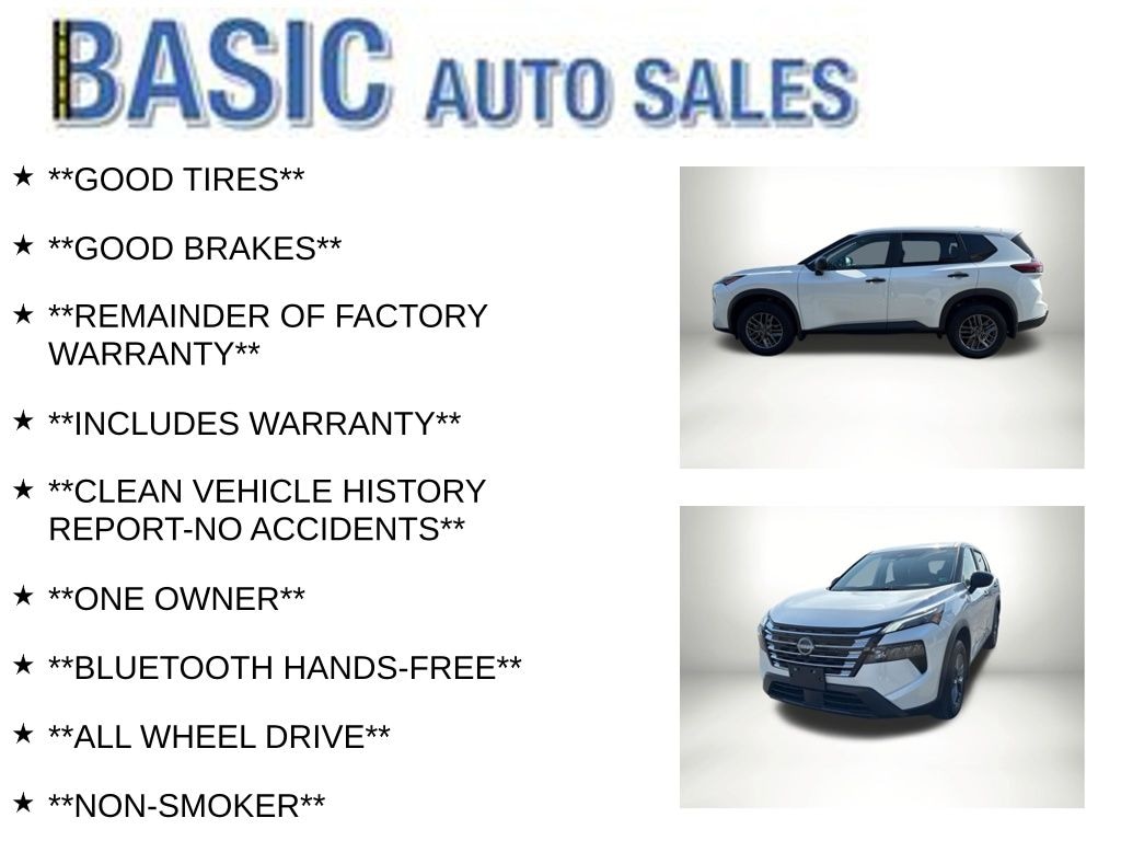 Everest White Pearl 2025 Nissan Rogue S AWD CVT with Xtronic 1.5L DOHC **GOOD TIRES**, **GOOD BRAKES**, **REMAINDER OF FACTORY WARRANTY**, **INCLUDES WARRANTY**, **CLEAN VEHICLE HISTORY REPORT-NO ACCIDENTS**, **ONE OWNER**, **BLUETOOTH HANDS-FREE**, **ALL WHEEL DRIVE**, **NON-SMOKER**, **REMOTE START**, **LOADED WITH SAFETY FEATURES**, **BLIND SPOT MONITOR SYSTEM**, **LANE KEEP ASSIST**, **LANE DEPARTURE WARNING**, **FRONT COLLISION WARNING**, **V-6 POWER**, 2 keys.