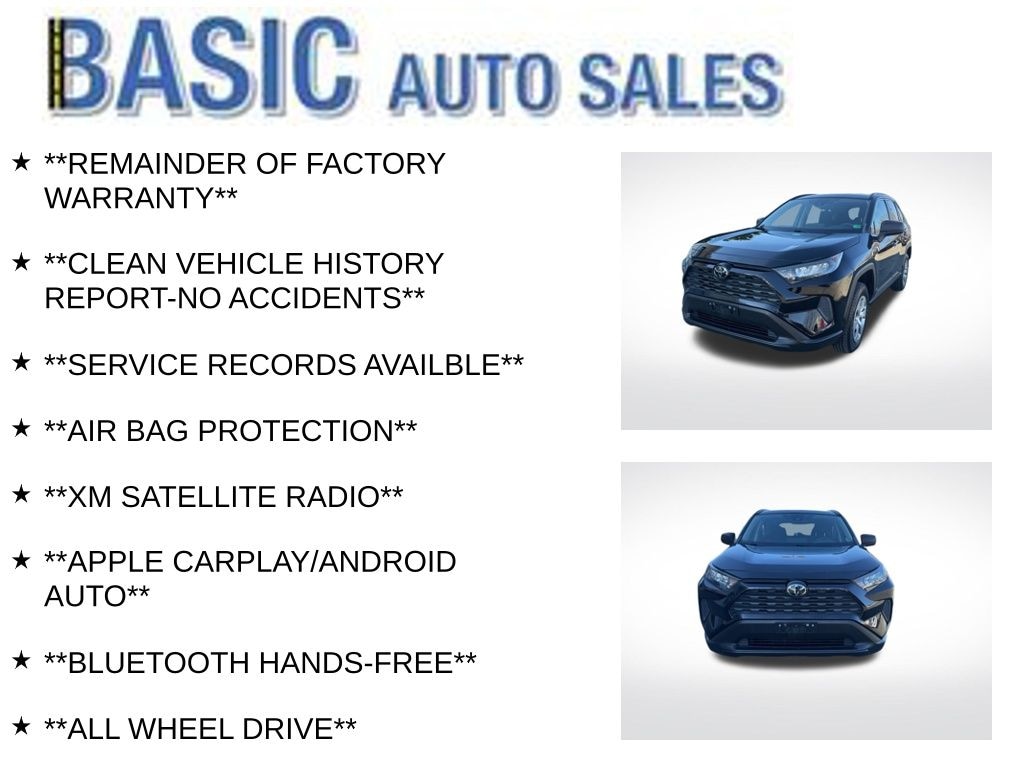 Midnight Black Metallic 2021 Toyota RAV4 LE AWD 8-Speed Automatic 2.5L 4-Cylinder DOHC Dual VVT-i **REMAINDER OF FACTORY WARRANTY**, **CLEAN VEHICLE HISTORY REPORT-NO ACCIDENTS**, **SERVICE RECORDS AVAILBLE**, **AIR BAG PROTECTION**, **XM SATELLITE RADIO**, **APPLE CARPLAY/ANDROID AUTO**, **BLUETOOTH HANDS-FREE**, **ALL WHEEL DRIVE**, **LANE DEPARTURE WARNING**, **BACK UP CAMERA**, **GREAT GAS MILEAGE---FUEL EFFICIENT**.